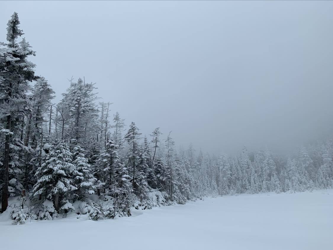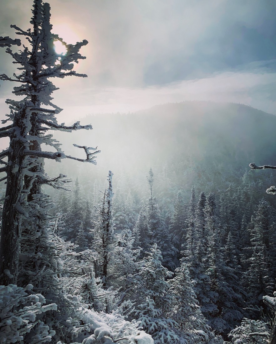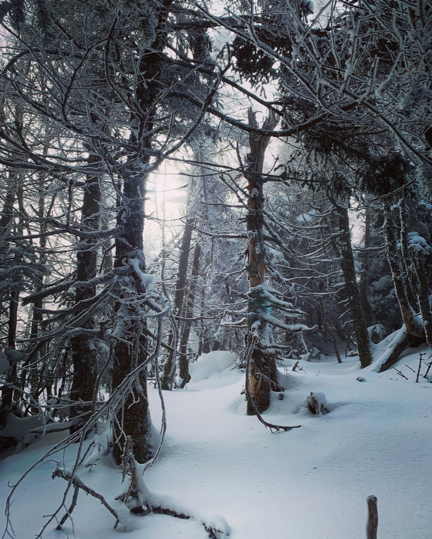I’m moving towards the sun, but we won’t meet for half a mile. For now, I travel through an inverted cloud. Its company is quiet and comforting. As I turn to look out over the forest of spruce and fir, the cloud embraces me with arms of mist. Its watery breath draws near, and I can hear a cold whisper close to my ear, “What are you doing with your head in the clouds?” I’ve heard this all before.